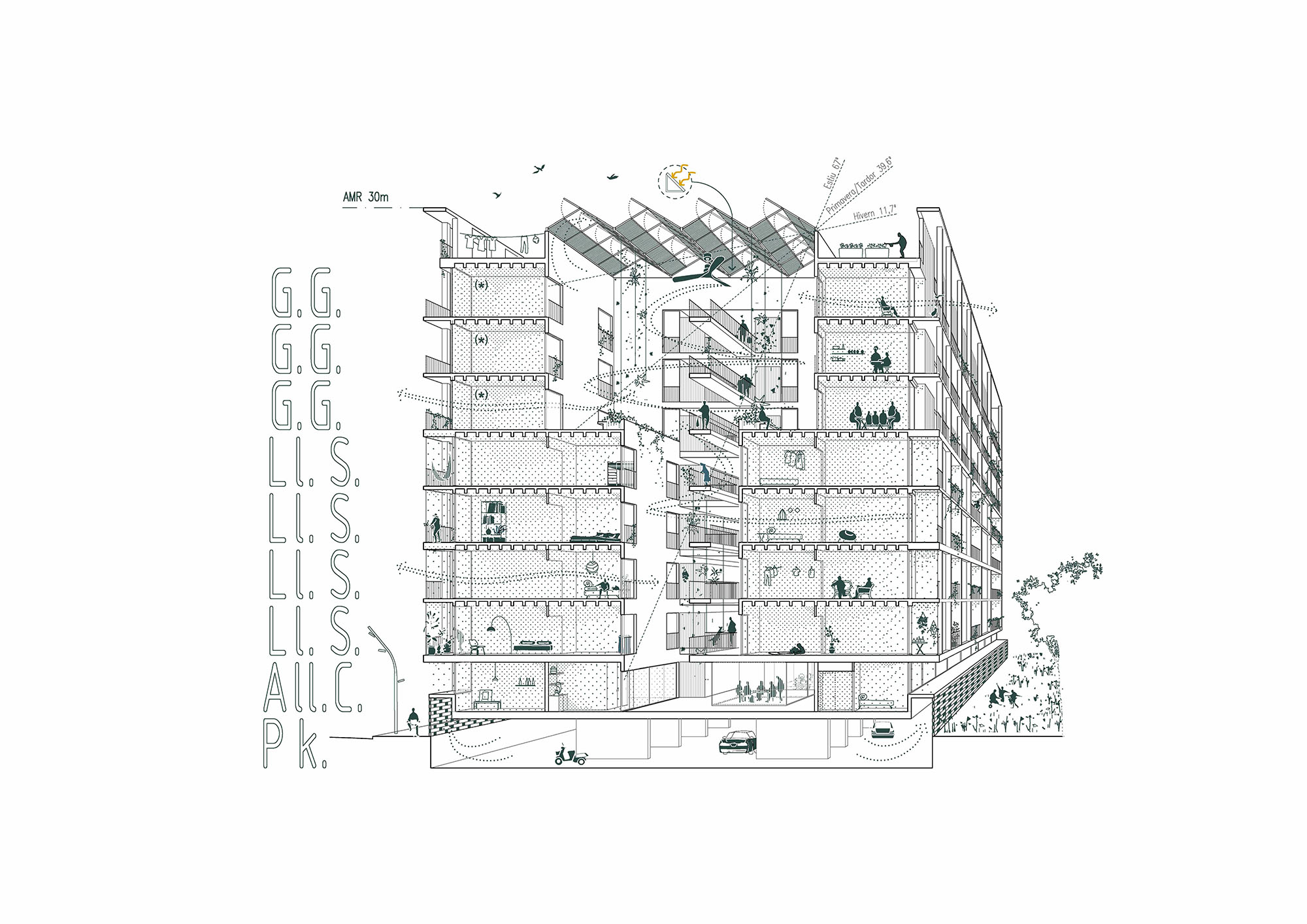 Regarding the facade solution, the most relevant are the balconies acting as bioclimatic buffers.