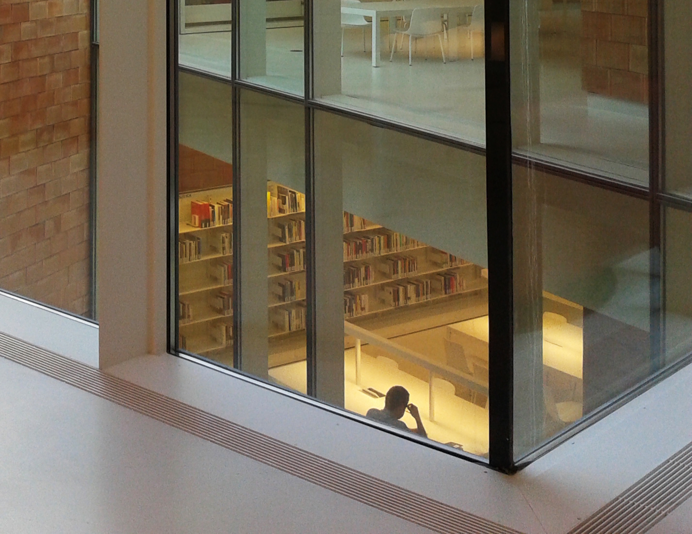 With great elegance, this white lacquered steel curtain wall closes openings that let natural light fill the reading rooms.