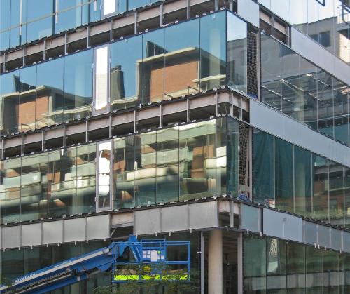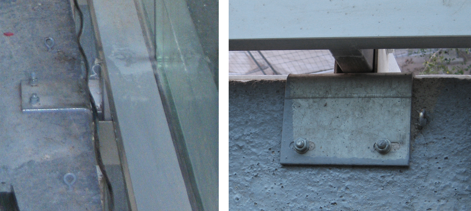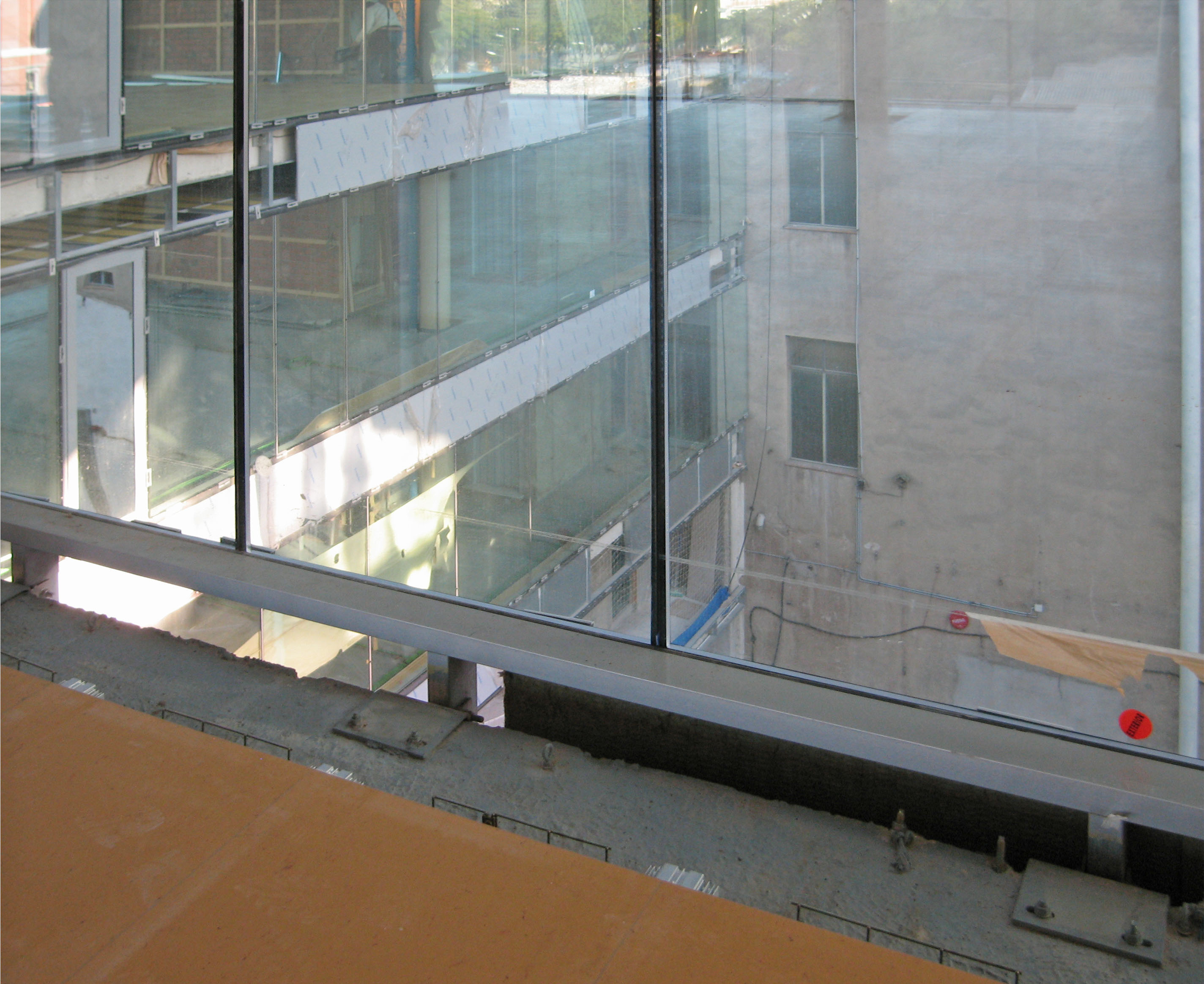 In IEP, the courtyard and the interior office space are perceived as a continuum. This close relationship between inner and outer spaces is one of the most interesting aspects of the building. The façade solution is the resource needed to achieve this. The glass enclosure is freed from any structure just by making the glass work like plates resting on two supports instead of four. The supports are simple structures in the front of the slab, "cadiretas", designed to solve the connection between the concrete structure and the façade.
