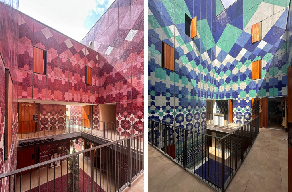 Michael Pinsky also plays with the scale of the pattern: the crowning of the courtyard, visible from afar, is resolved with large-scale geometric motifs, while the lower levels, closer to the user, feature smaller, more domestic patterns that allow the rhythm of the design to be appreciated up close.