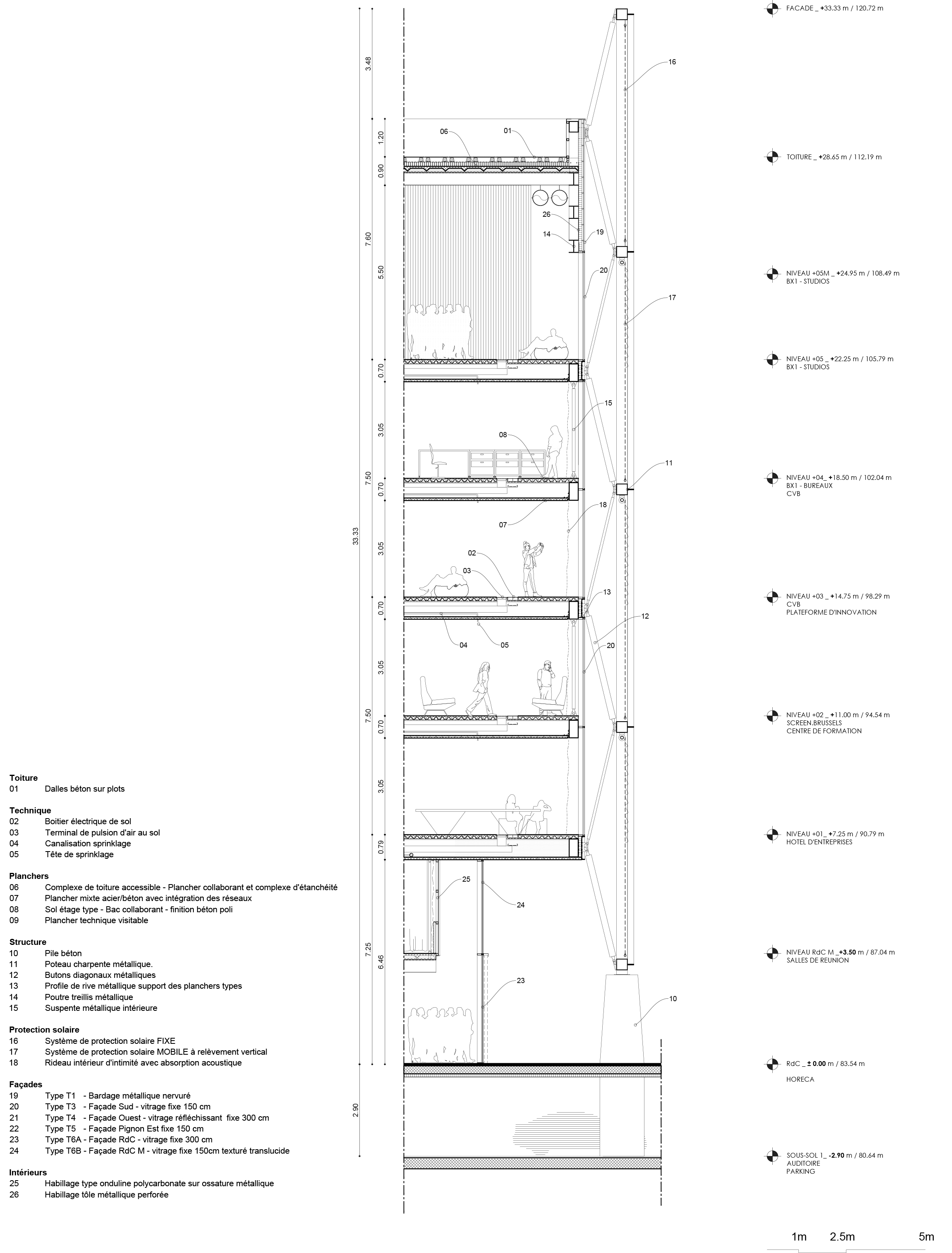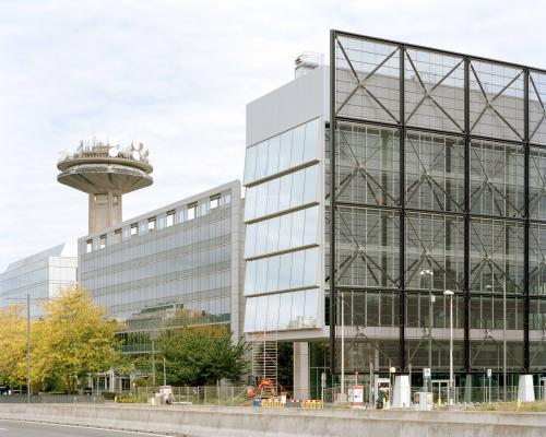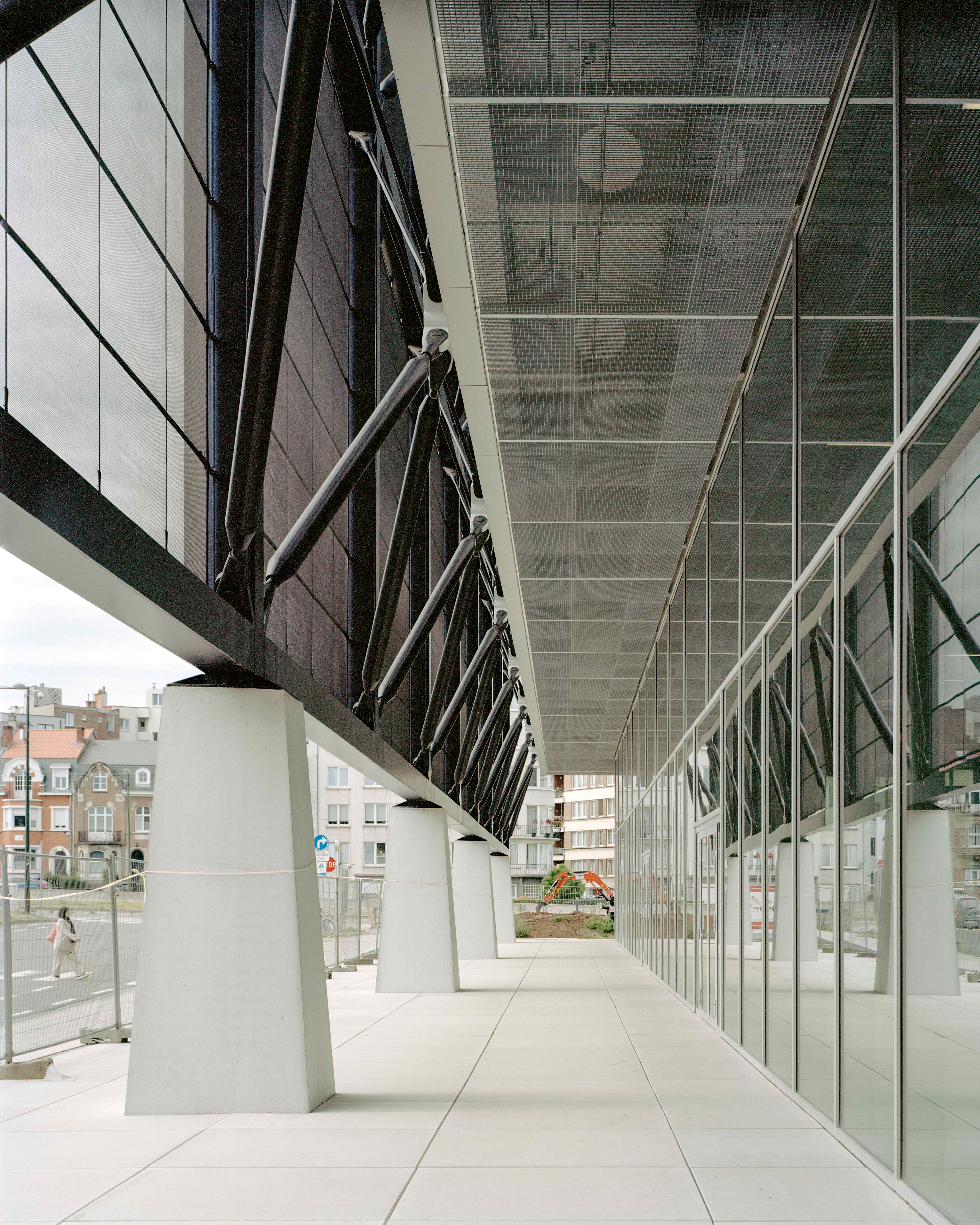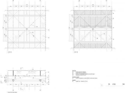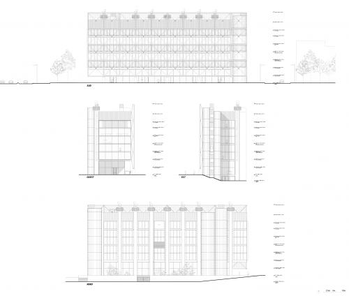Its exterior position, acting as an exoskeleton, allows it to nuance the neutral envelope formed by the curtain wall and adapt it to different orientations. On the south façade, a three-dimensional truss composed of steel profiles incorporates a solar-shading system on its outer face. By contrast, the north façade is constructed through the systematic repetition of prefabricated T-shaped concrete columns, which integrate the building services and provide stability against horizontal loads.
