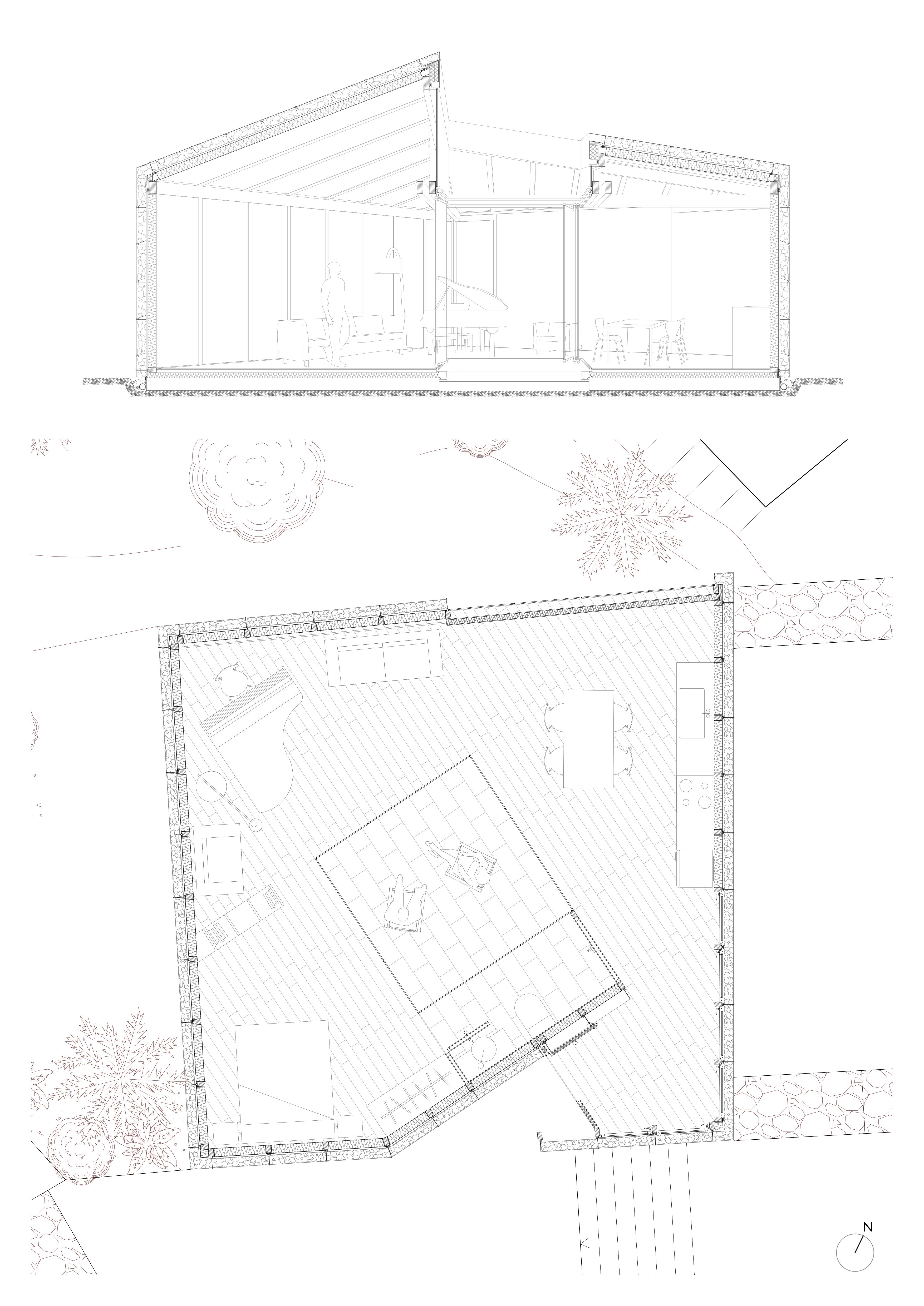 Beneath the shadow of Vilafamés castle and under the look of Sang's church we find our site, a gap happening at the end of the crooked narrow streets of the medieval village. A place where diverse ruins generate different levels in the steep terrain, thus, we will make use of the course to stablish a rhythm and a system for this place. This course is going to relate all the different spaces, from the most public zone, to the most private one, creating a mechanism which recovers the red stones found in there as gabion walls. The functional program is solved by setting a module type able to fit the specific requirements which are demanded, so we can generate an homogeneous landscape with the whole intervention. At the end, what we can perceive is its continuous red stone envelope which cover completely the module and give so an special character to the project.Within the study of the solar chart, we take into account that the sun hours during winter are completely zero, as the most favourable ones get blocked by the topography itself. This is the reason why we decide to make completely opaque facades, so the energetic loss are completely minimized, then the unique openings are the one facing the South-west views, over the plana de Castelló, and the ones occurring in the patio, which try to get certain solar gains. Moreover, the huge landscape window is protected at night with a big sliding insulation panel.